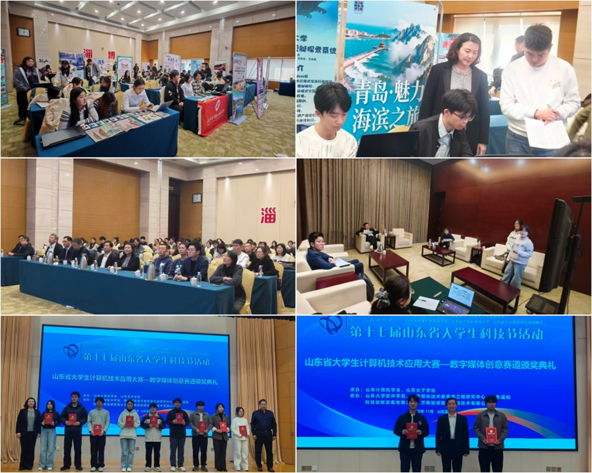 “山东省大学生科技节—山东省大学生计算机技术应用大赛-数字媒体创意赛道决赛”于2025年11月16日举行。决赛采用现场答辩与作品布展相结合的形式,分三组同步进行,各队围绕“数字教育”、“智慧康养”、“黄河流域生态保护和高质量发展”三大主题进行了答辩展示。经过紧张激烈的角逐,赛事于当日下午结束,共评选出卓越创意奖2项、一等奖10项、二等奖25项、三等奖78项;同时授予103名教师“优秀指导教师”称号,9家单位获评“优秀组织奖”。随后举行的颁奖典礼上,山东大学孟祥旭教授为典礼致辞,山东女子学院副校长李缨宣读了大赛评审结果。
